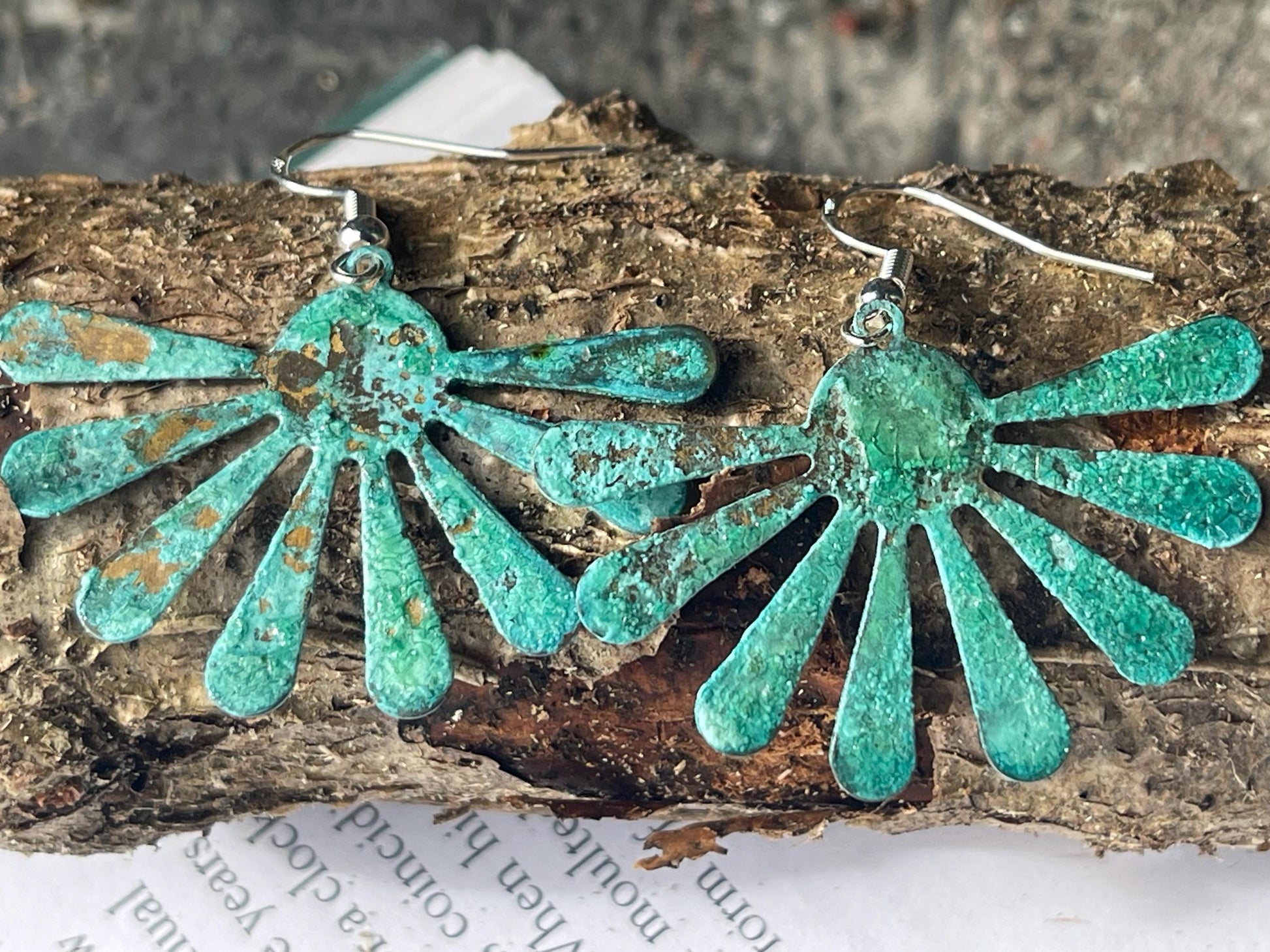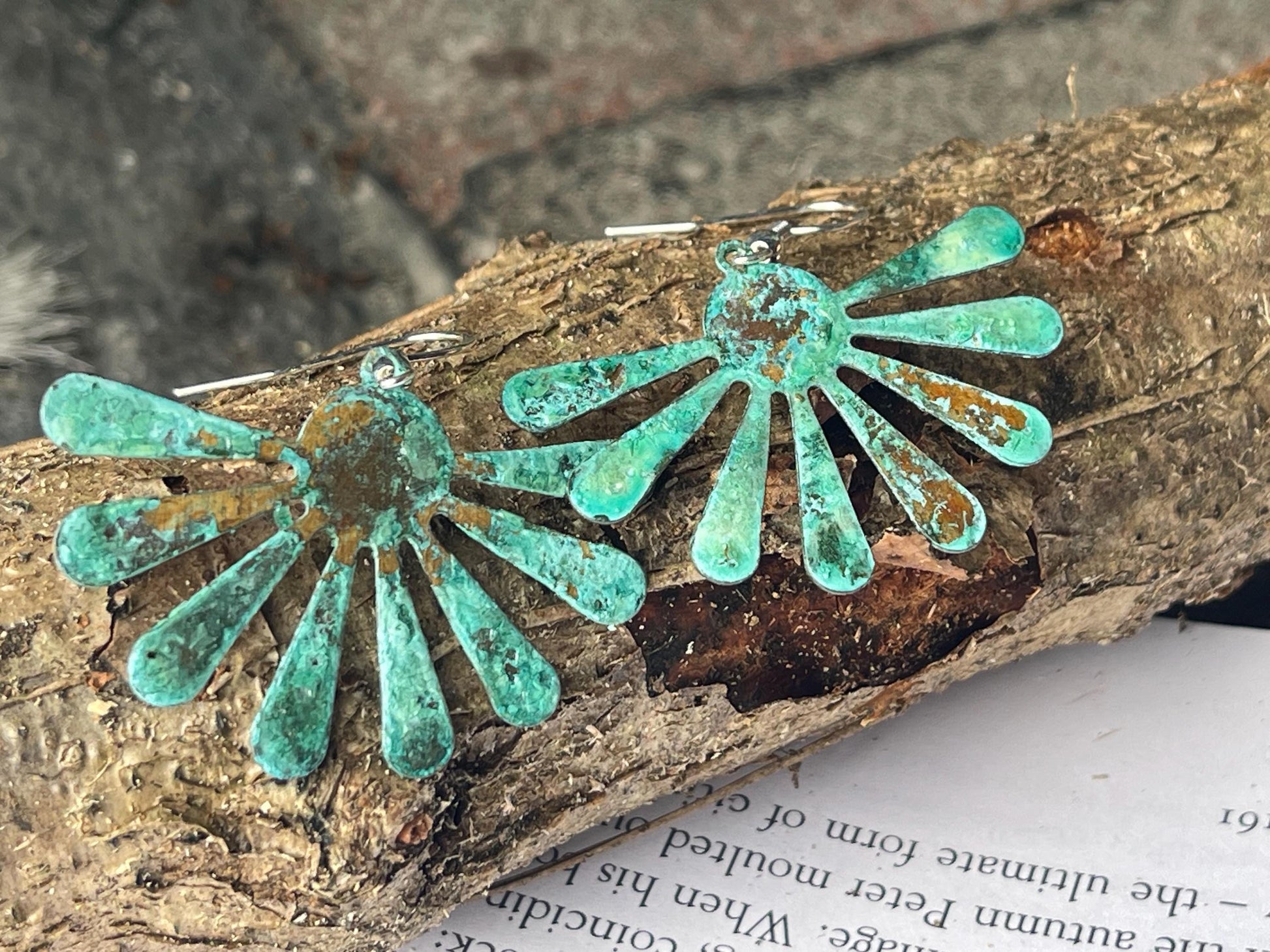 Stunning rustic half flowers that I have naturally patinered to reveal these beautiful shades of bluey green. They are hung on sterling silver.