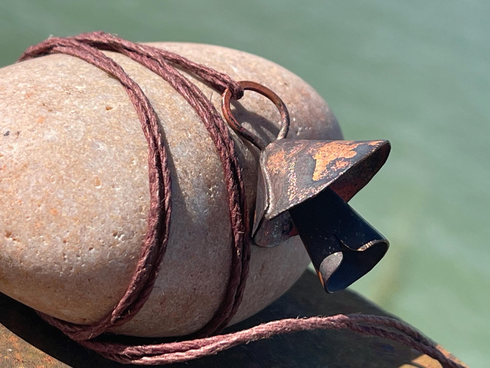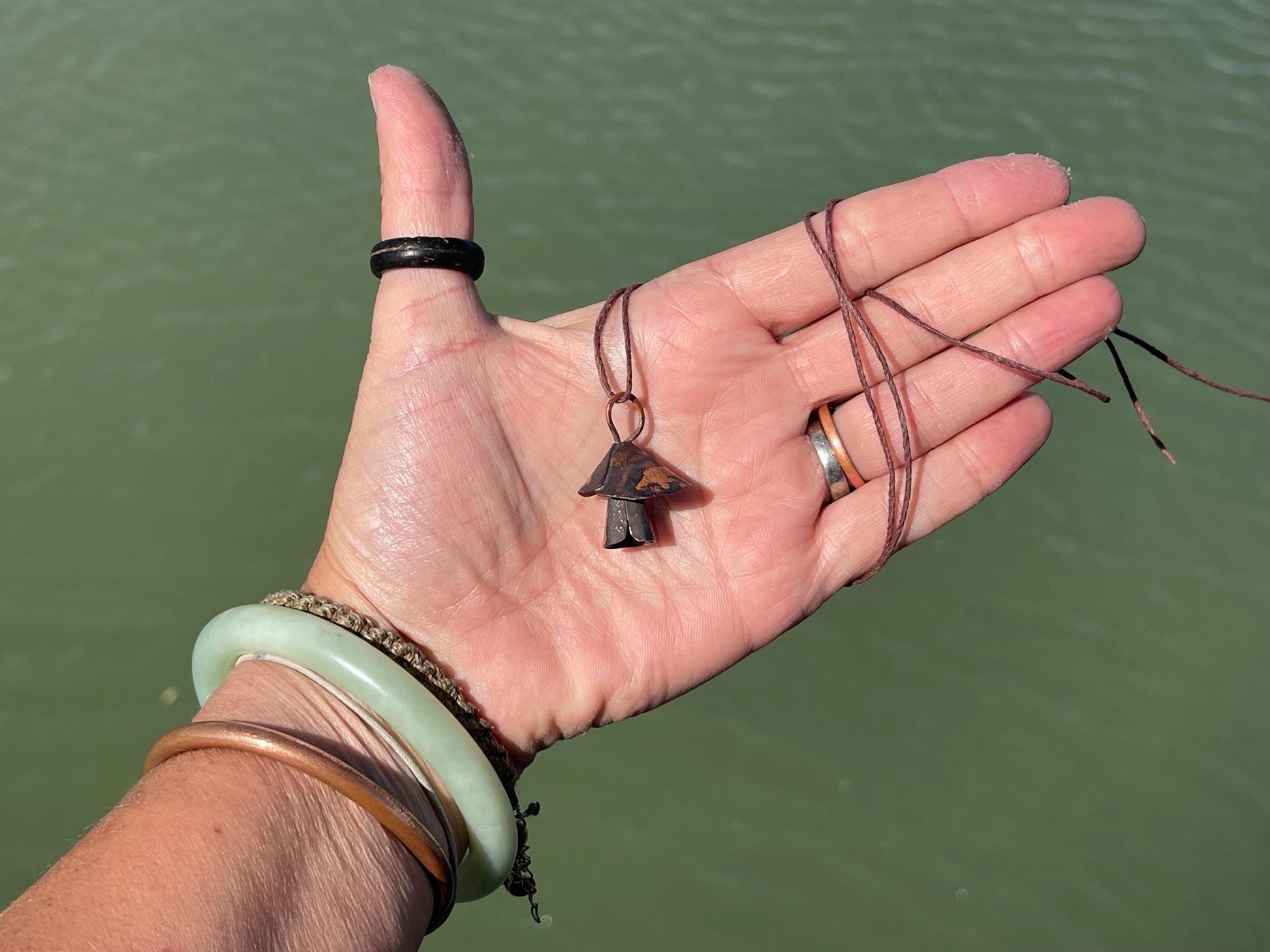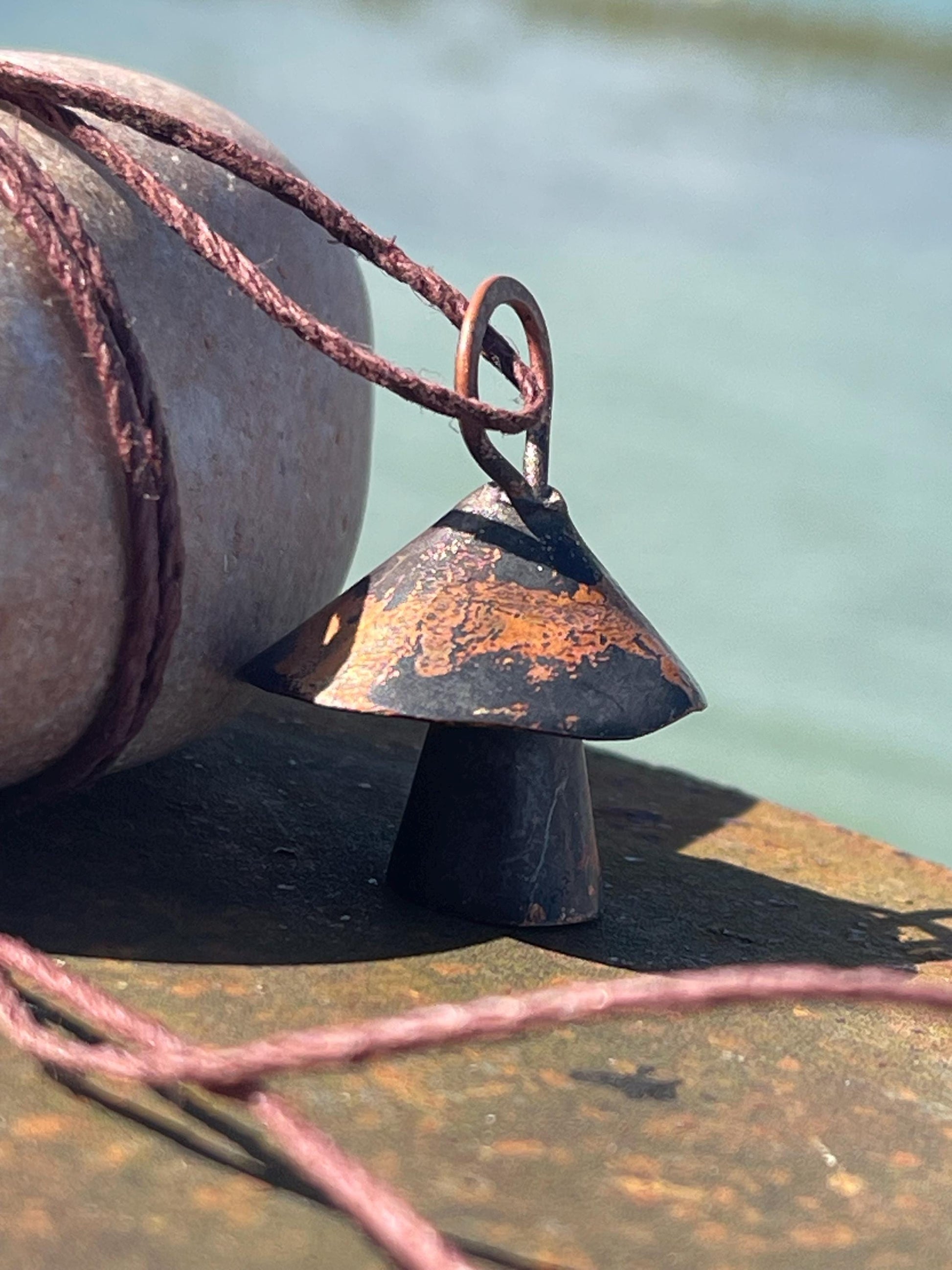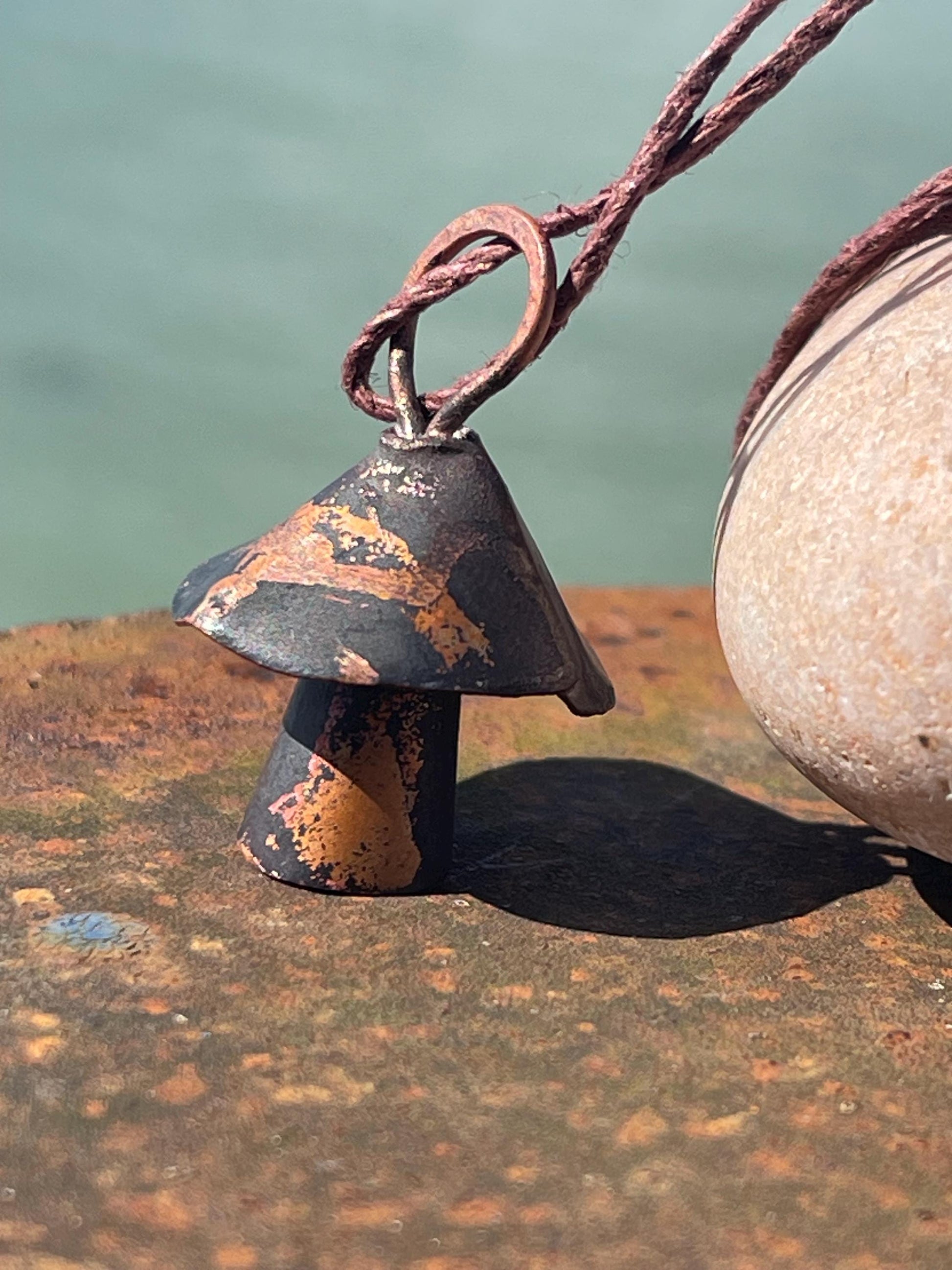 Mushroom necklace made from copper. It is hung on hemp, left loose for you to tie at your preferred length.
