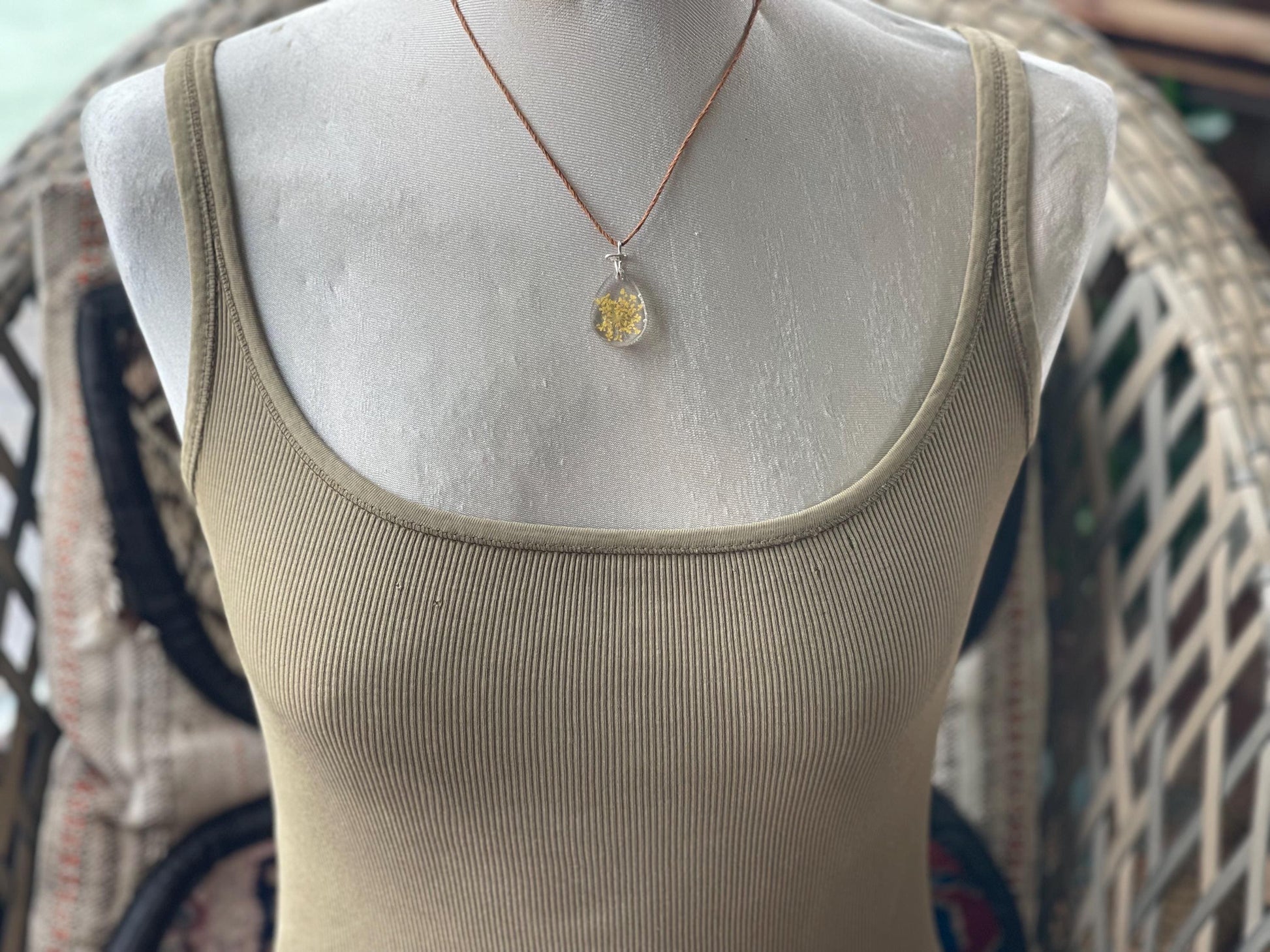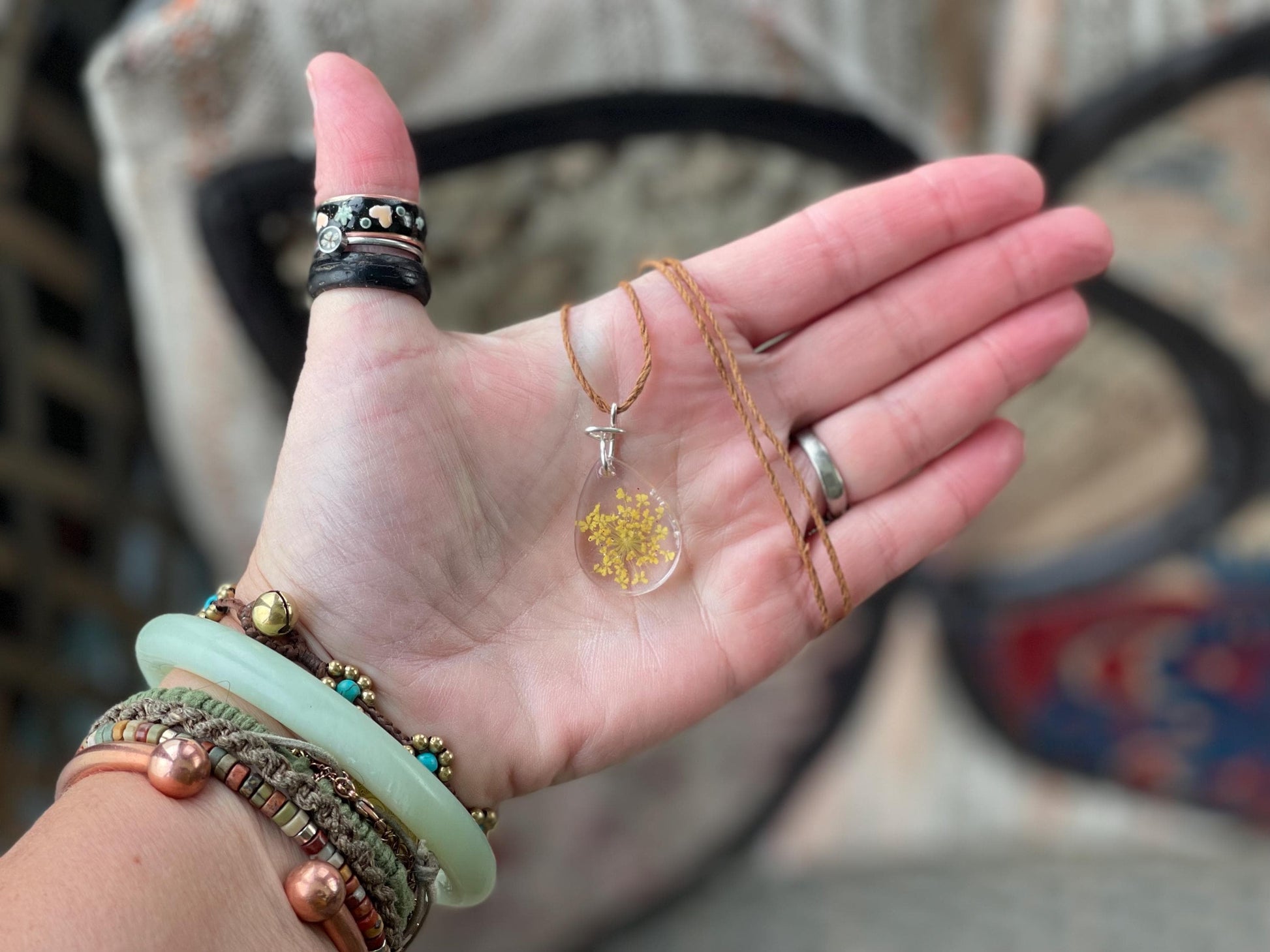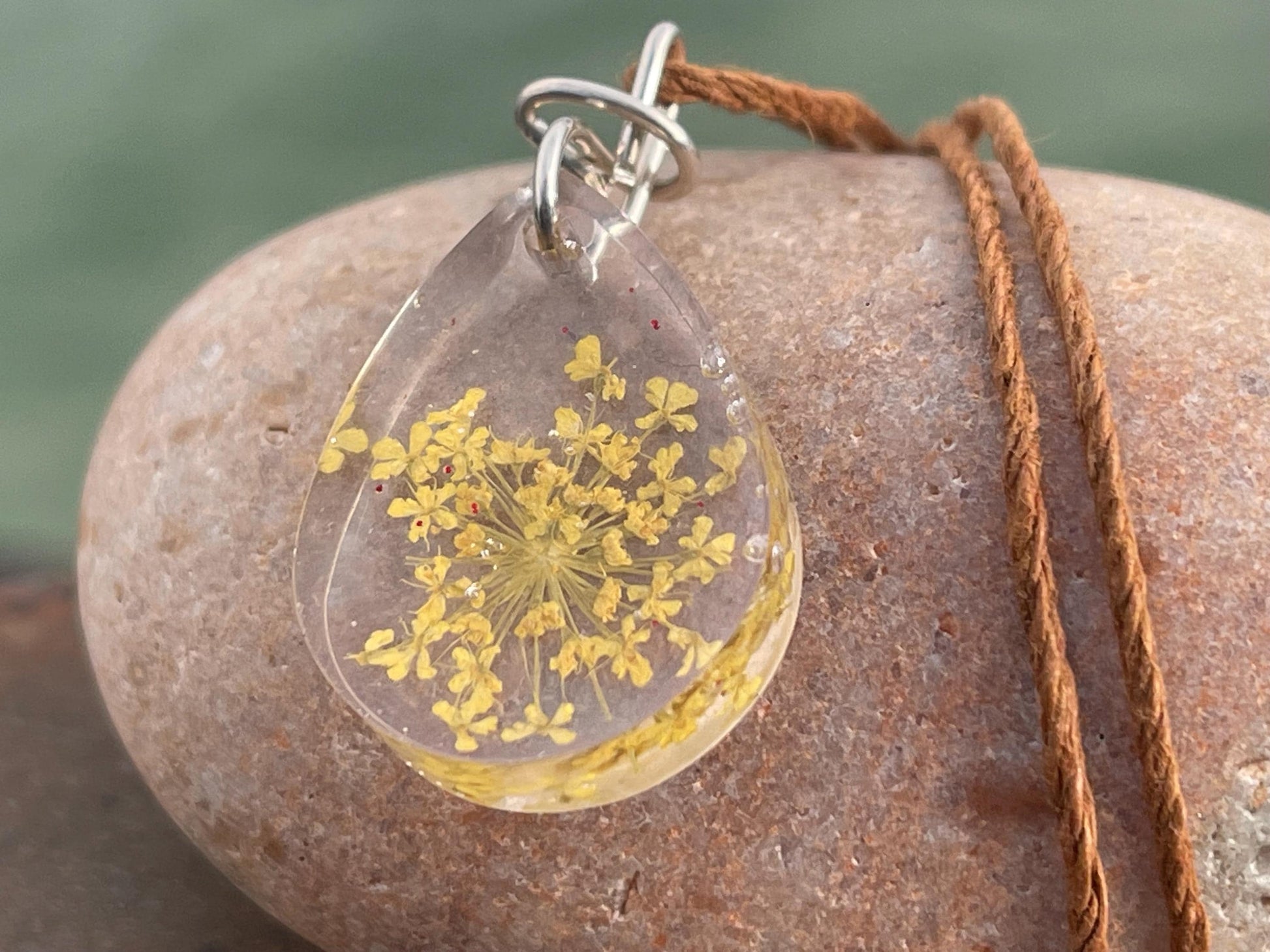 Parsley necklace made with a flower from my garden and recycled sterling silver. It is hung on sustainable hemp, left loose for you to tie at your preferred length.