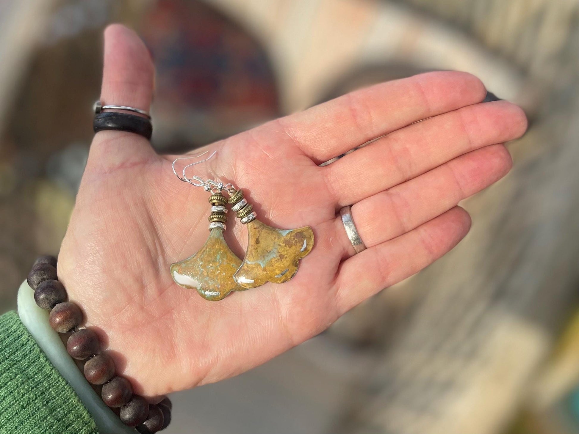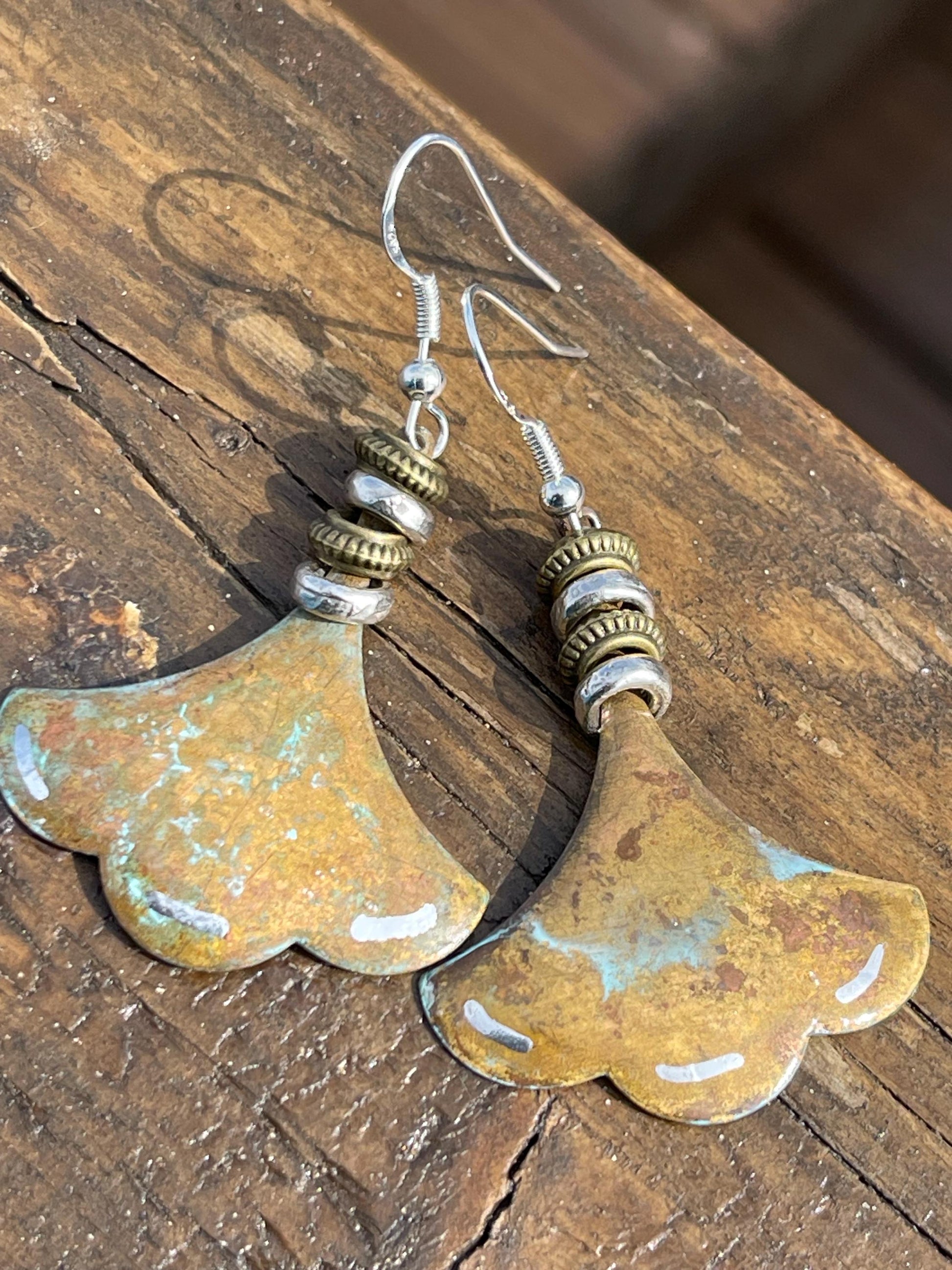 Stunning earrings that I have naturally patinered (no chemicals used) to reveal these beautiful shades of blue and gold. I have also used some soft silver paint and blended it in with the natural patina. They are hung on sterling silver ear hooks.