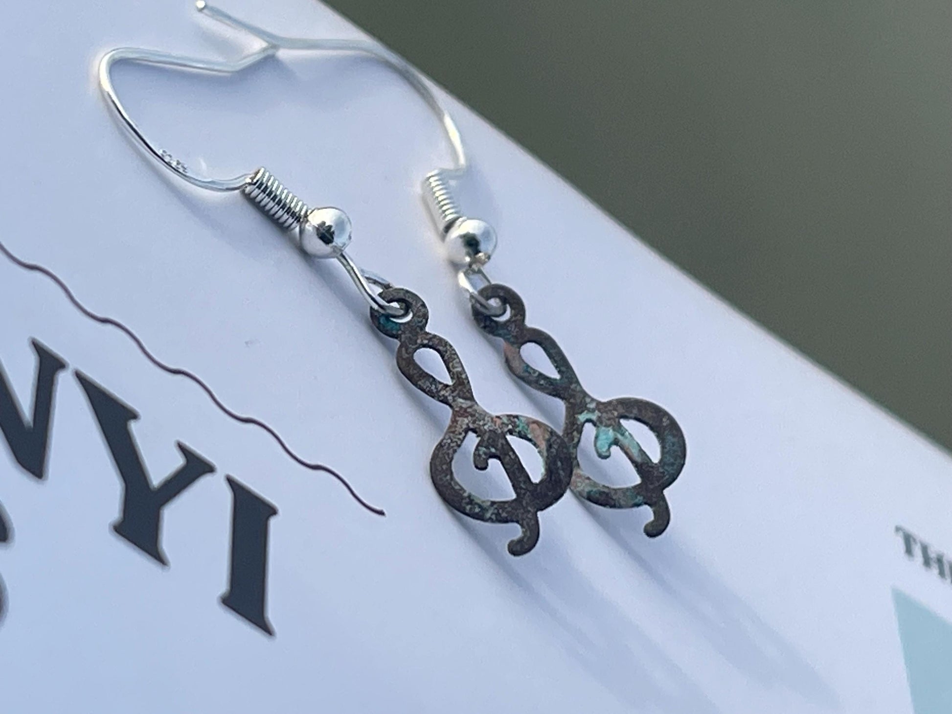 These earrings feature little treble clefs made from naturally weathered brass. They are hung on sterling silver.