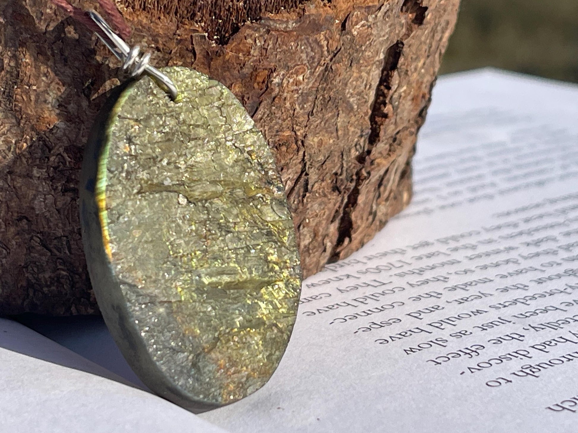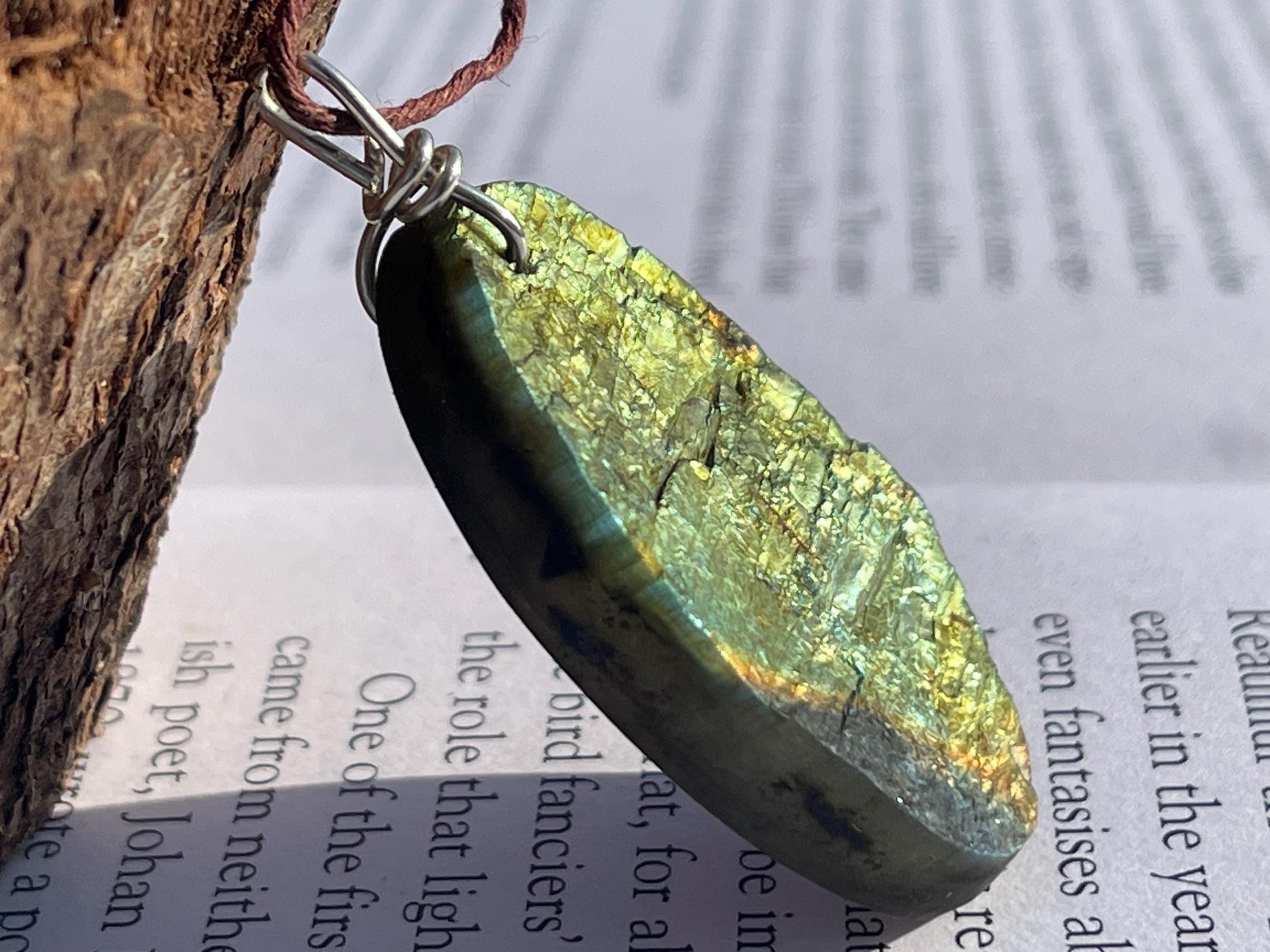 This is a beautiful piece of labradorite. It looks very different in different lights with beautiful shimmery colours coming through in the sunshine or under lights as the piece moves.