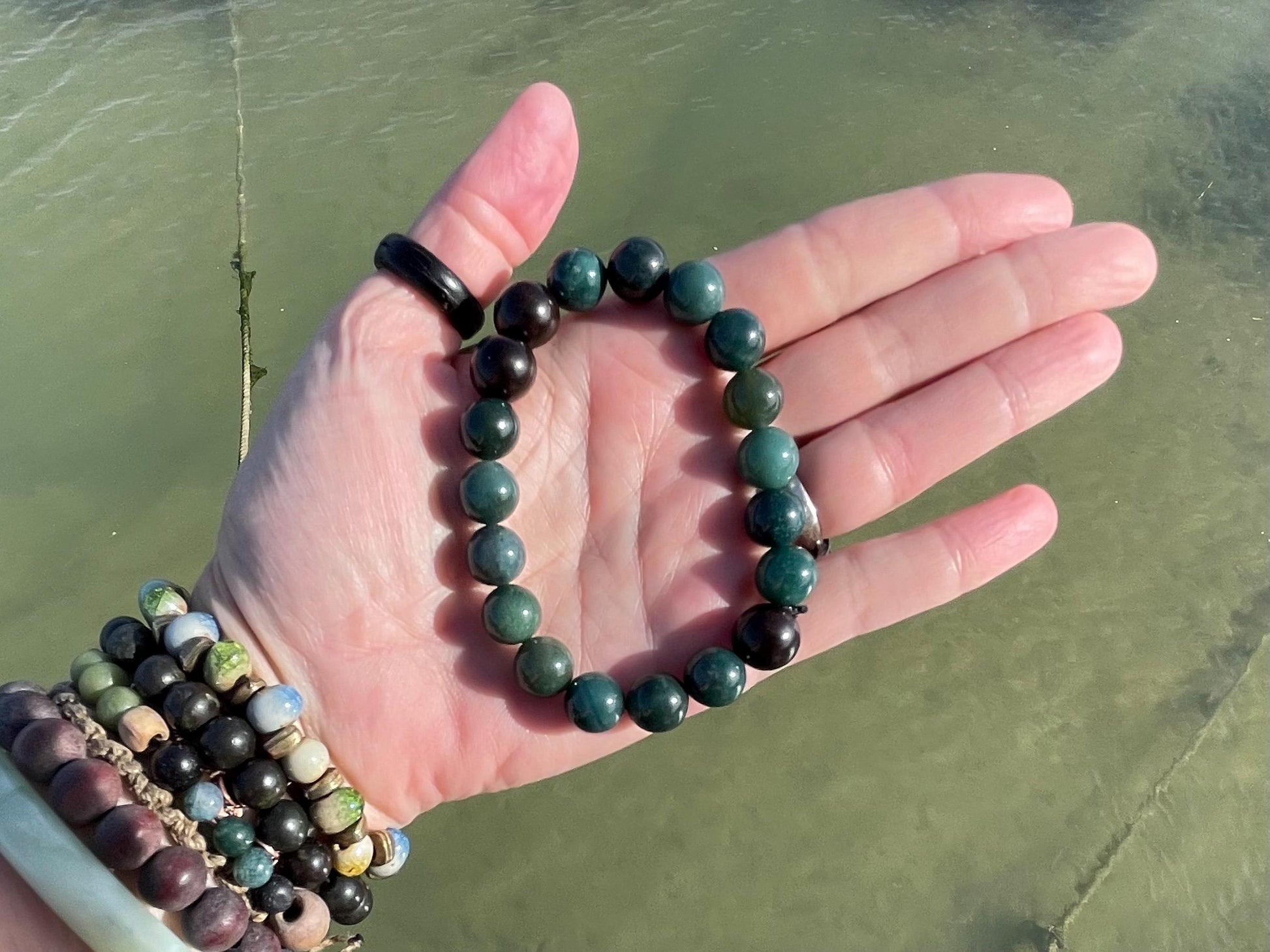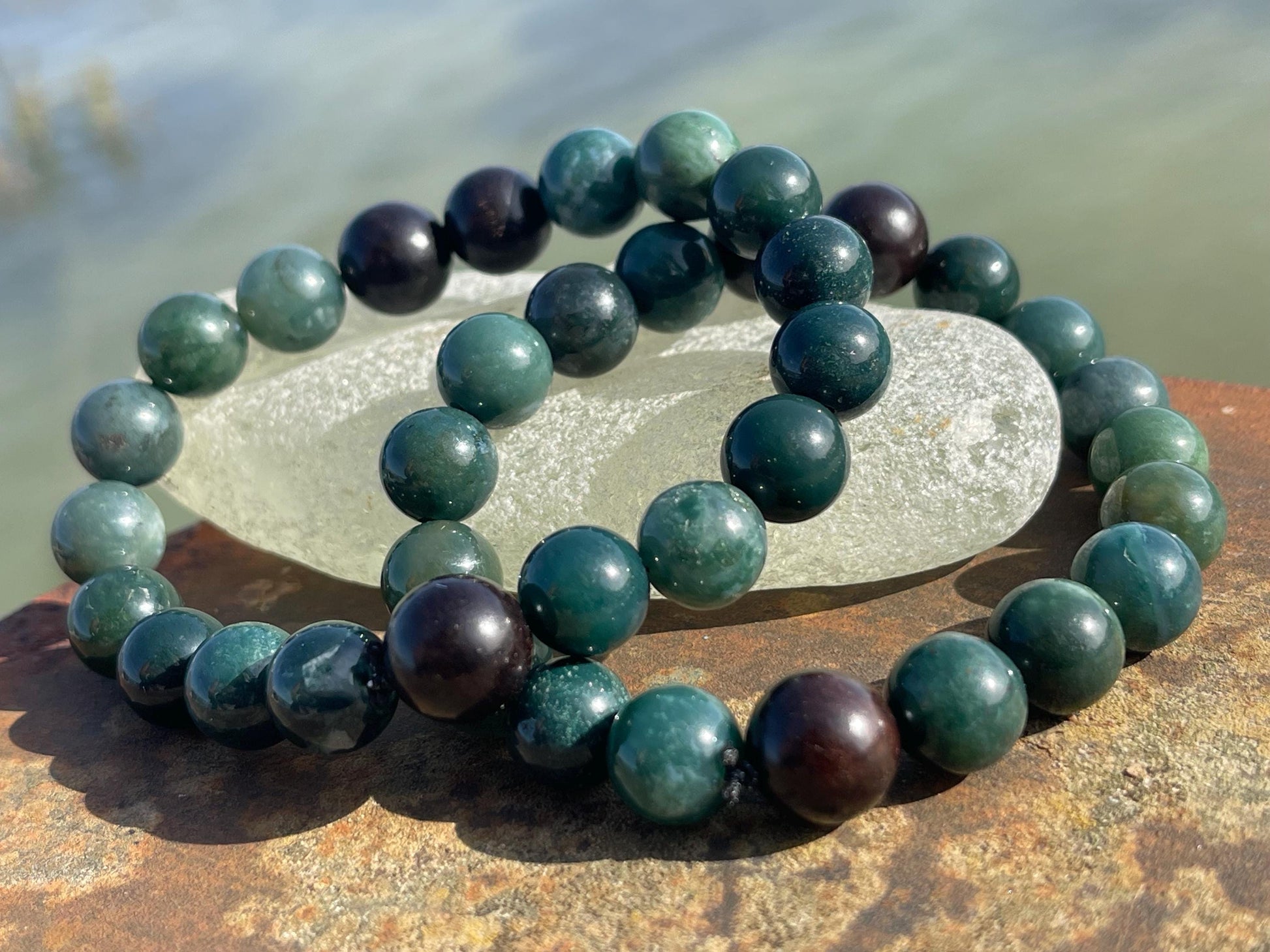 This is a handmade ethically sourced moss agate and tiger ebony wood bracelet. Moss agate is traditionally known as the gardeners stone and is known for its grounding properties.
