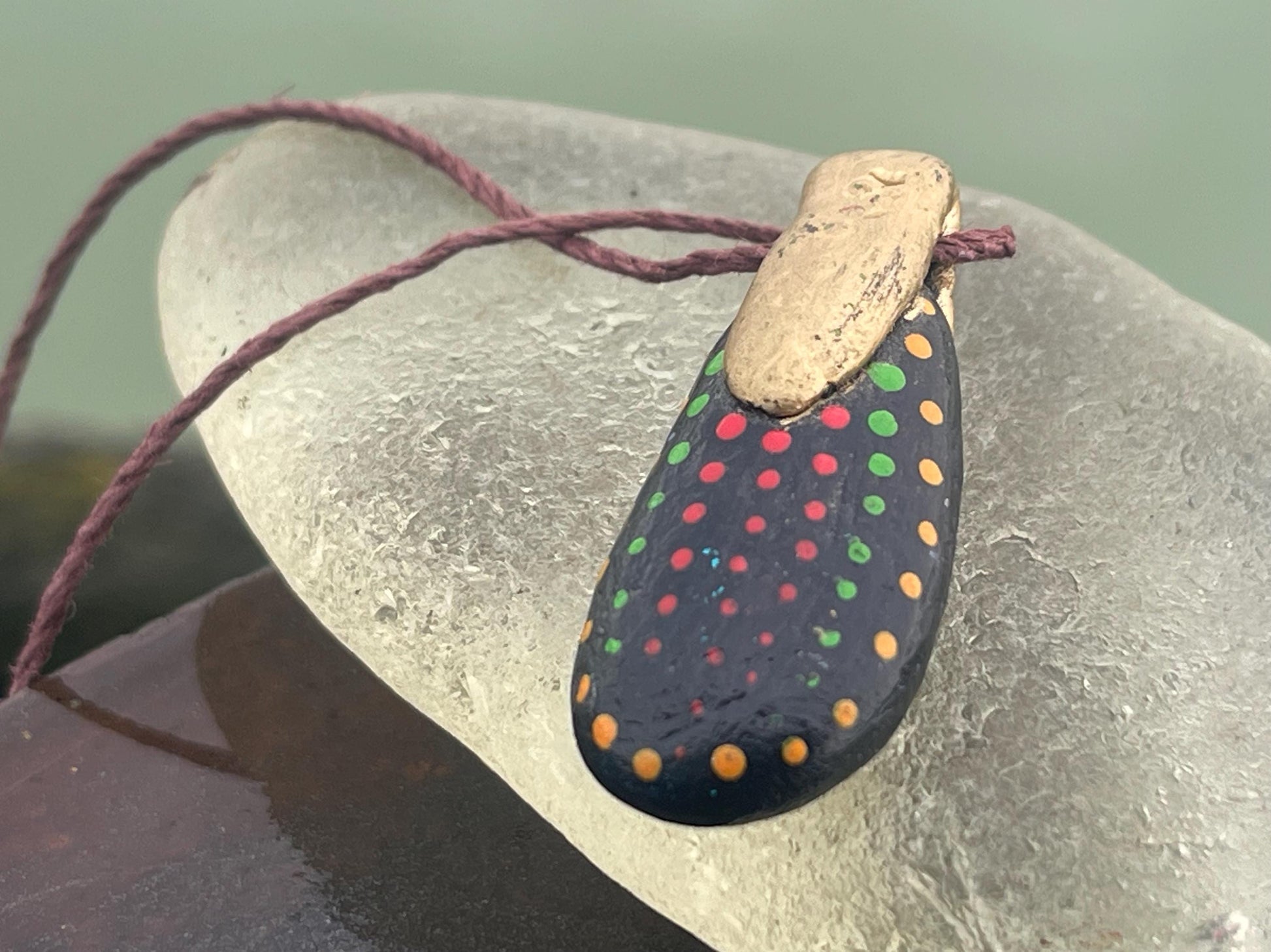 Pebble pendants. Painted pebble necklaces. Hand painted eco friendly necklaces. Eco friendly jewellery. Ethical handmade jewellery.