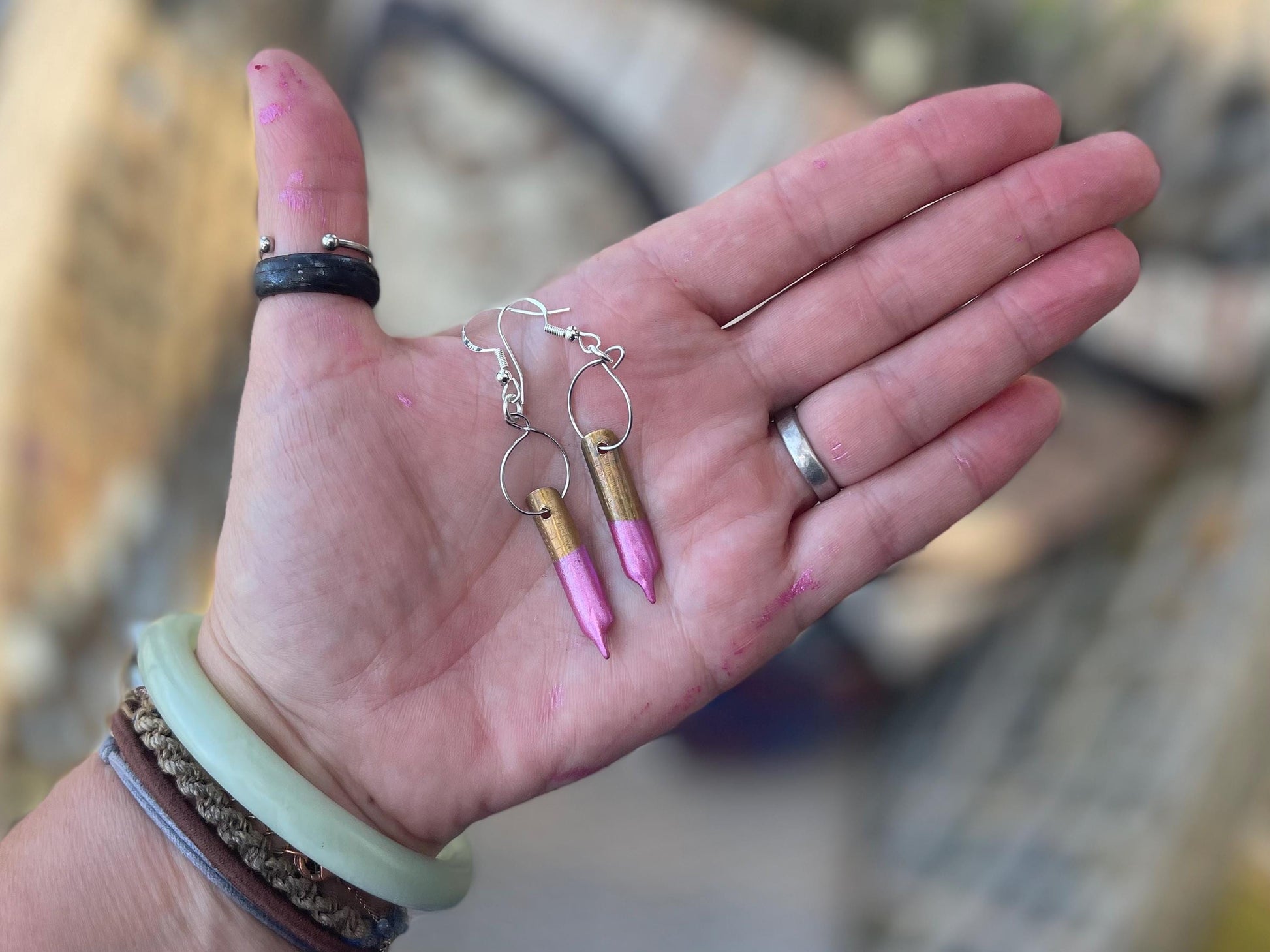 These earrings are made from old pen nibs which I have painted and hung on recycled sterling silver.
