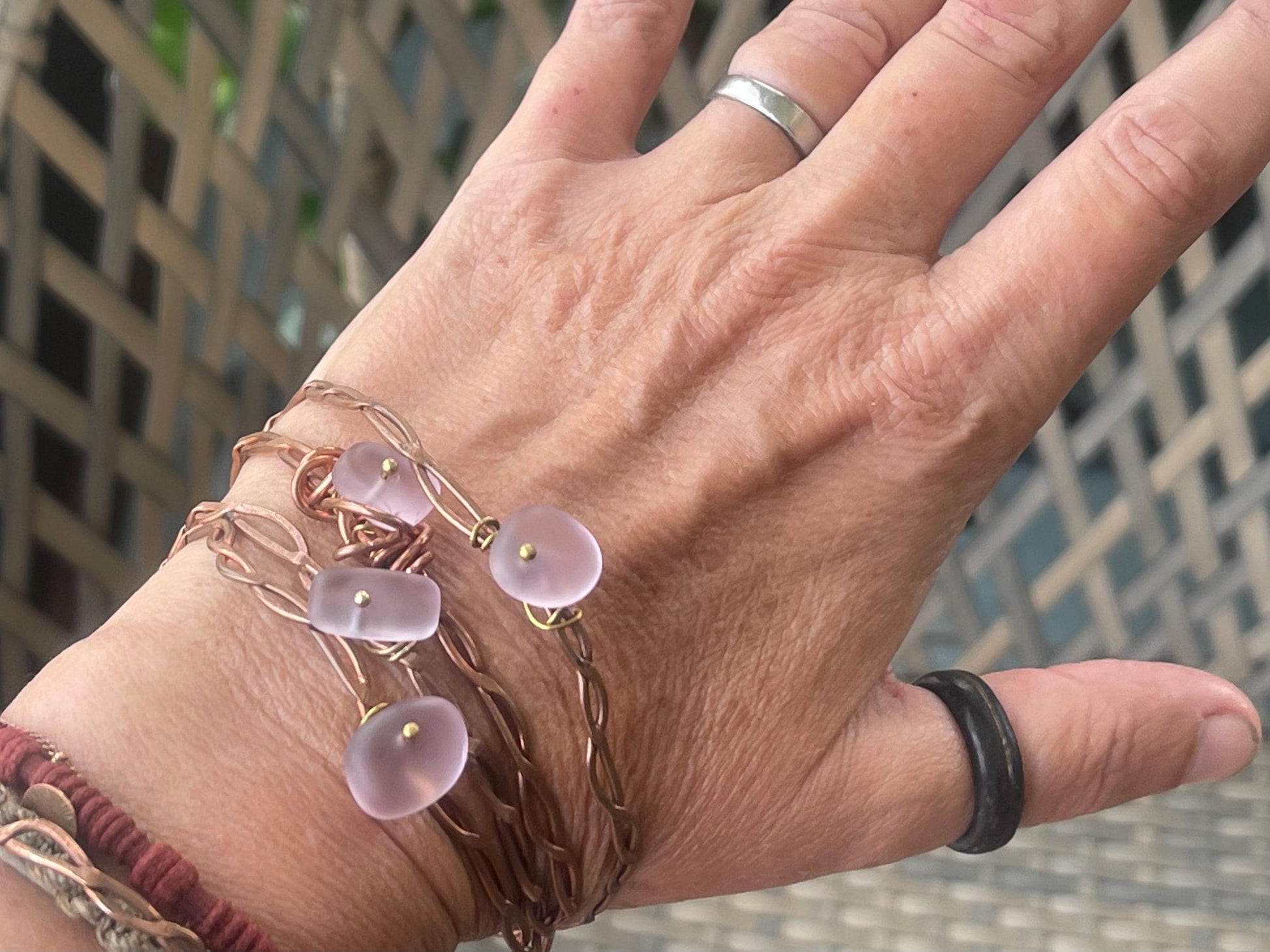 Rustic pink sea glass bracelets. Eco friendly and pliable (can be adjusted by simply bending/stretching them in or out) to suit a wide range of wrist sizes.