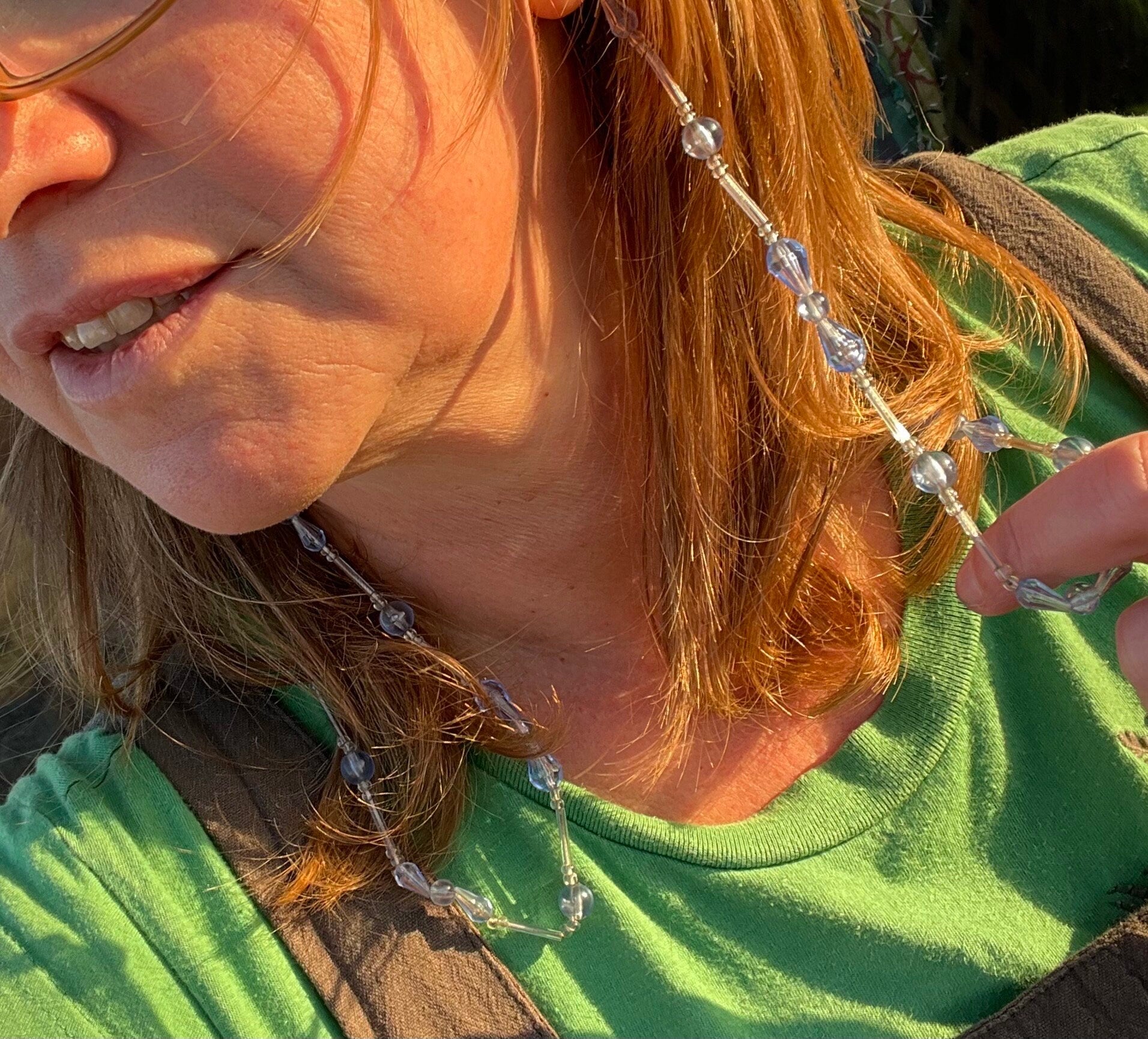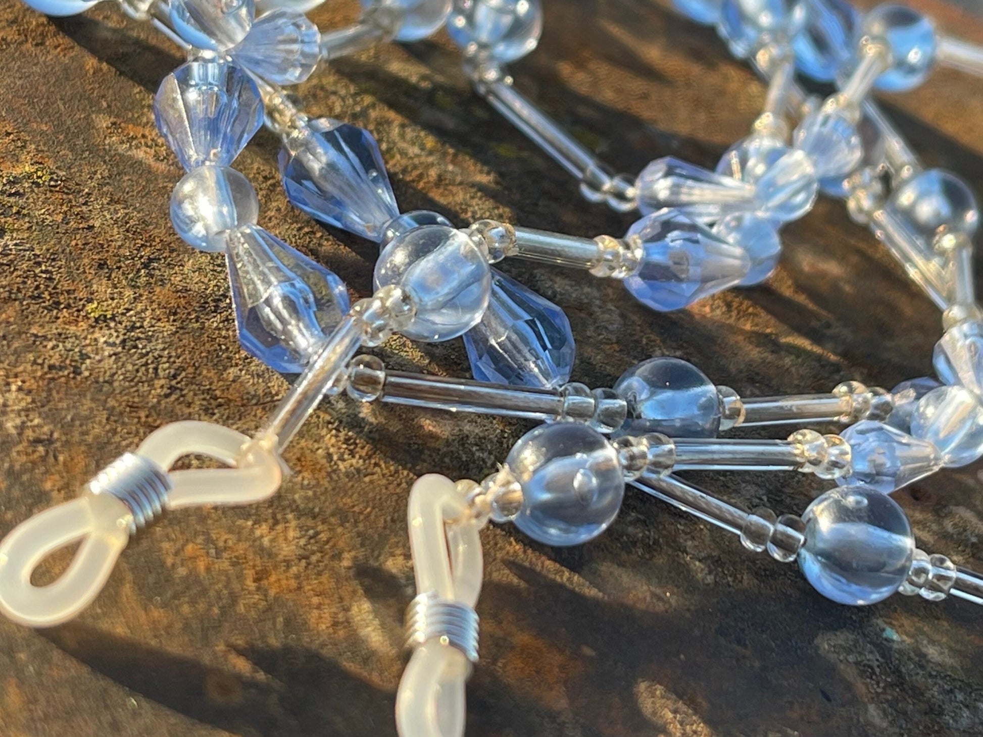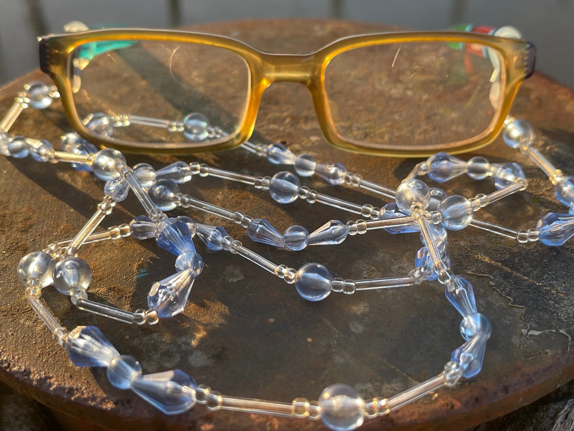 Blue glasses chain made using beautiful up cycled vintage beading.