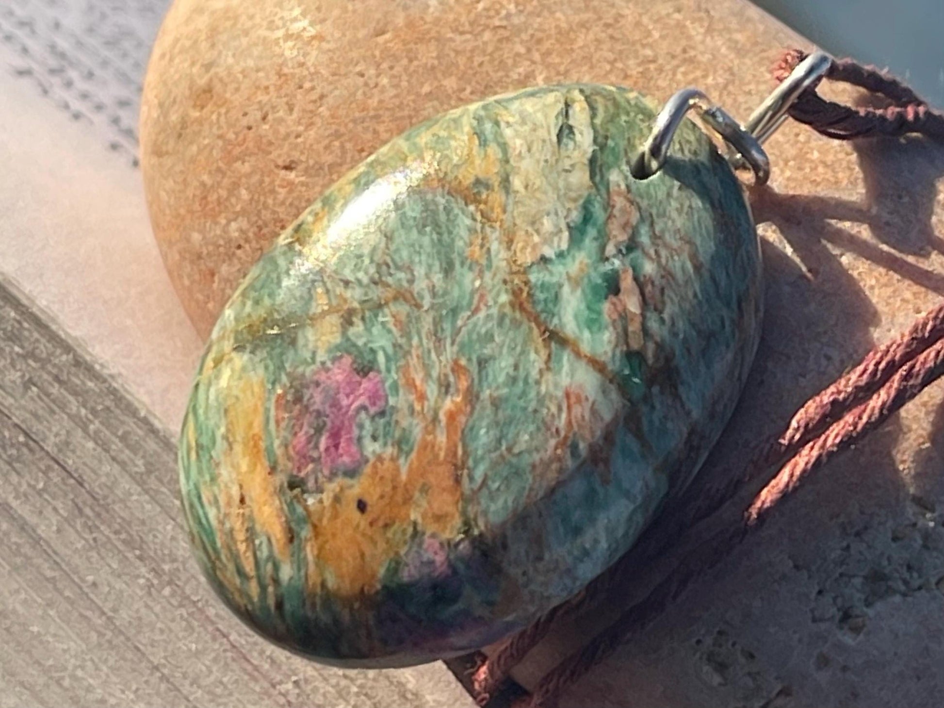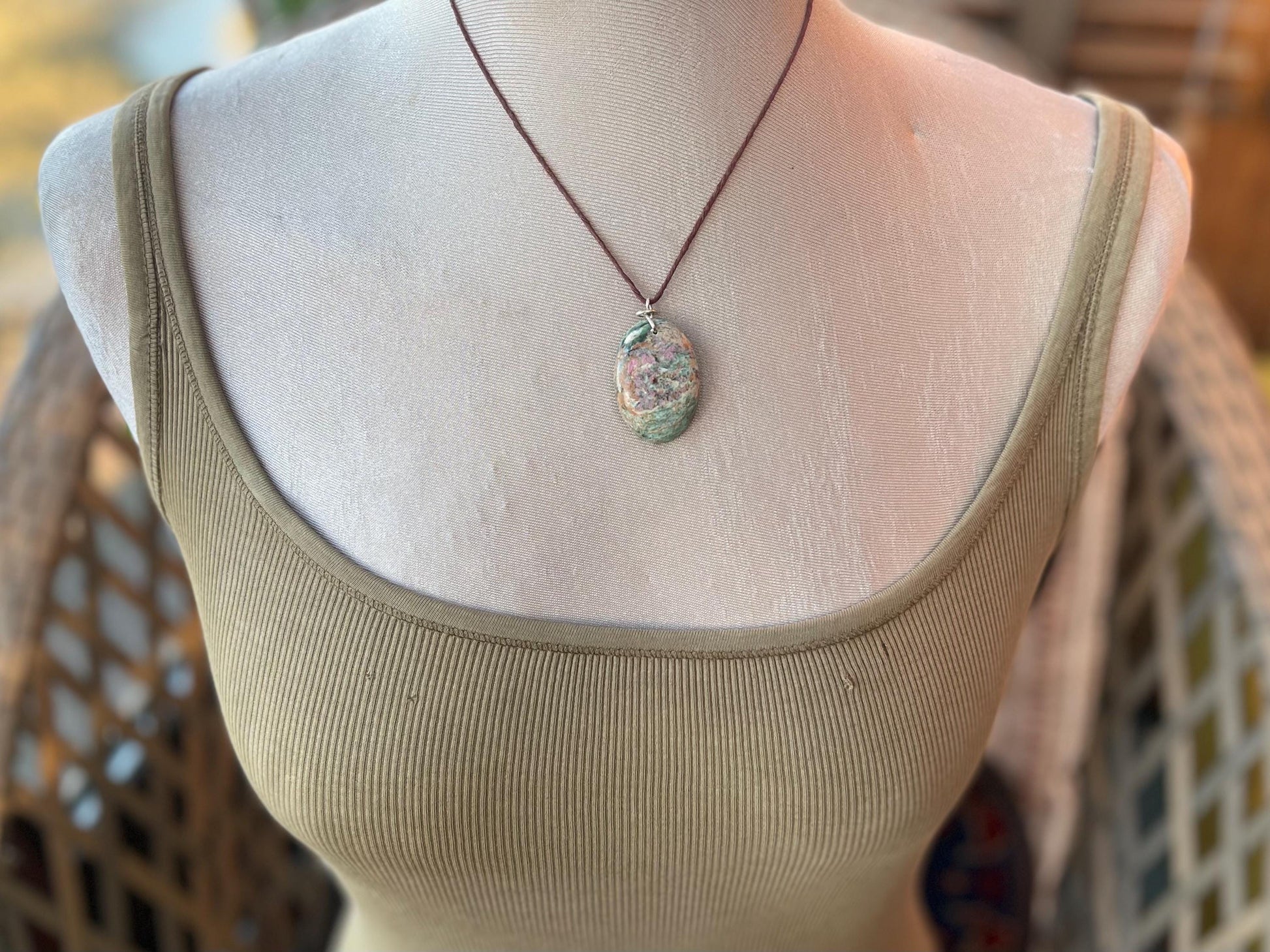 Ruby Fushsite necklace - handmade and unique. The stone is ethically sourced and wrapped in up-cycled brass. It is hung on hemp, left loose for you to tie at your preferred length.