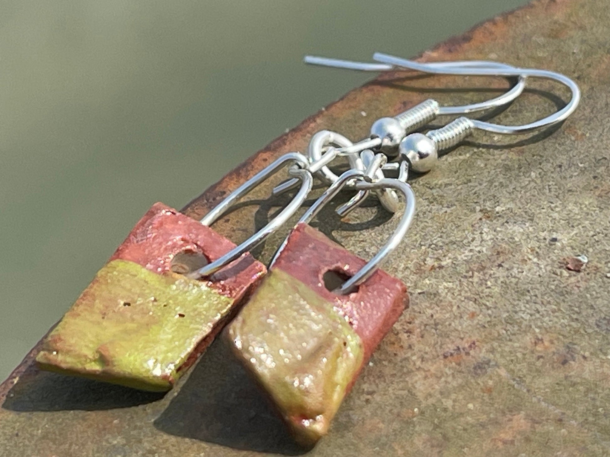 These earrings are made using almost entirely recycled materials. The sterling silver hoops are recycled and the ceramic was roughly formed using off-cuts of Sussex Clay before being painted (using a mixture of underglazes) and fired.