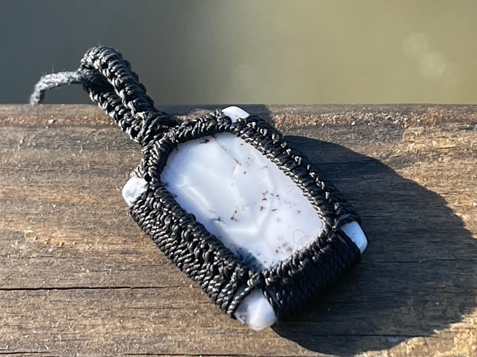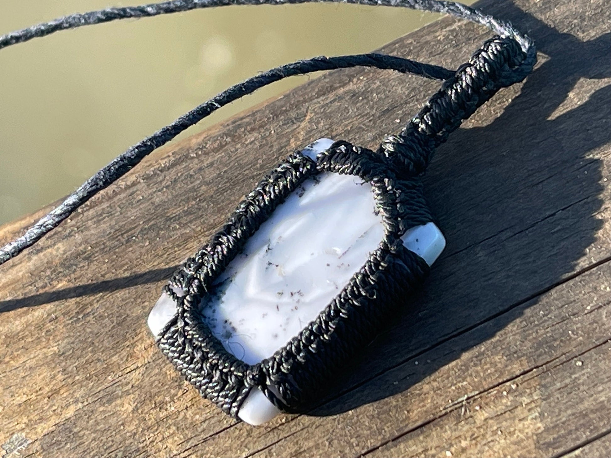 Snowflake obsidian gemstone, macrame wrapped and held on hemp. the hemp has been left loose for you to tie at your preferred length.