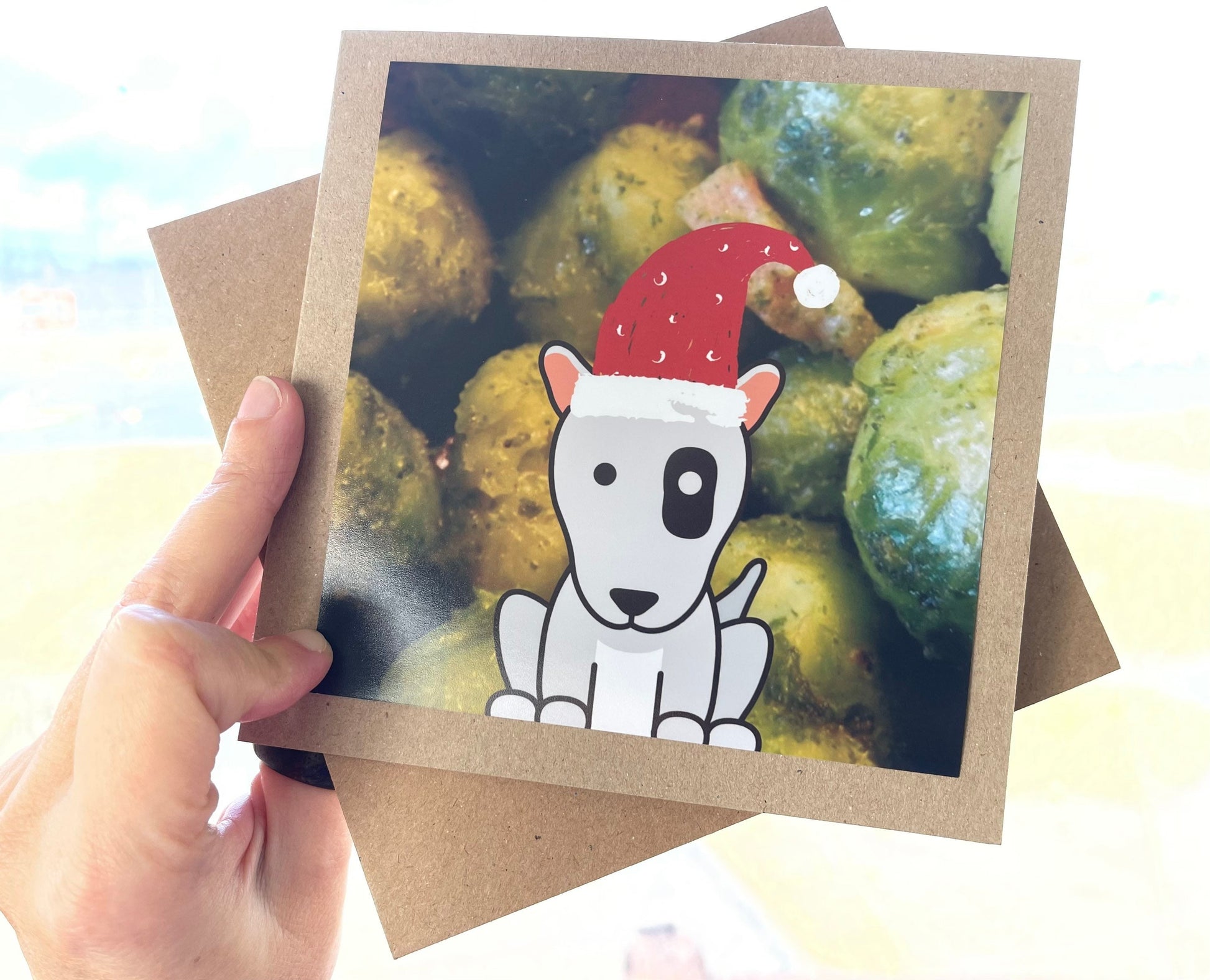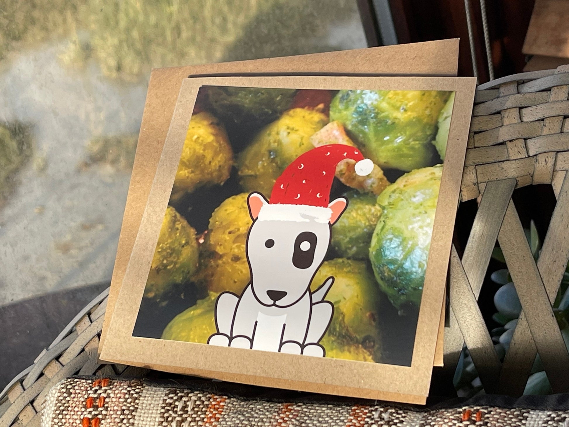 A fun card inspired by my love of animals. The dog is superimposed in front of a photograph I took of last years Christmas sprouts!!