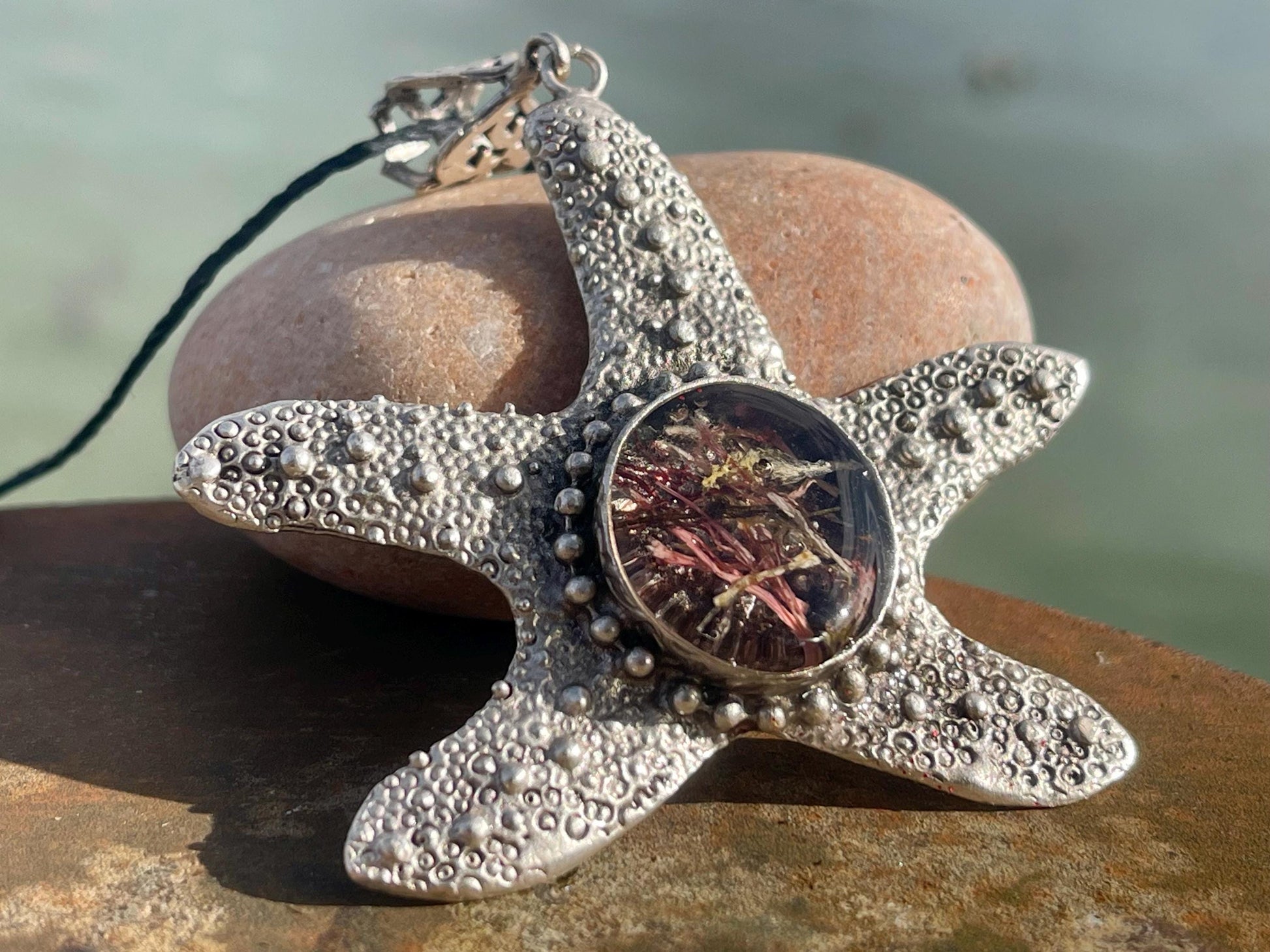 A striking starfish pendant containing seaweed which I gathered from my local beach.
