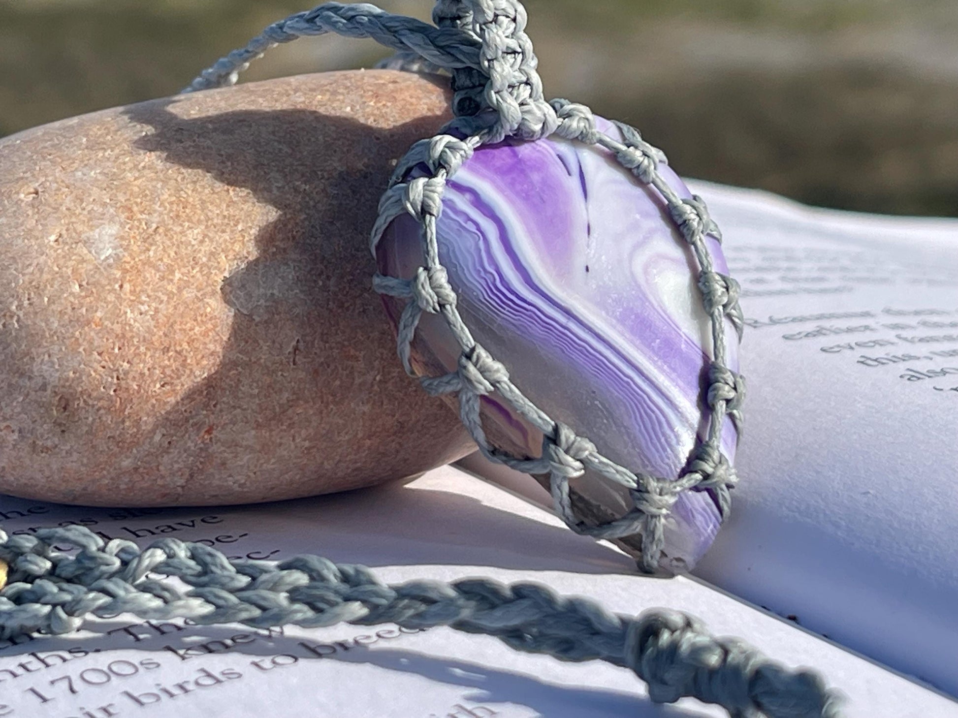 This is a beautiful and unique purple onyx necklace, macrame wrapped and held on a waxed cotton cord.