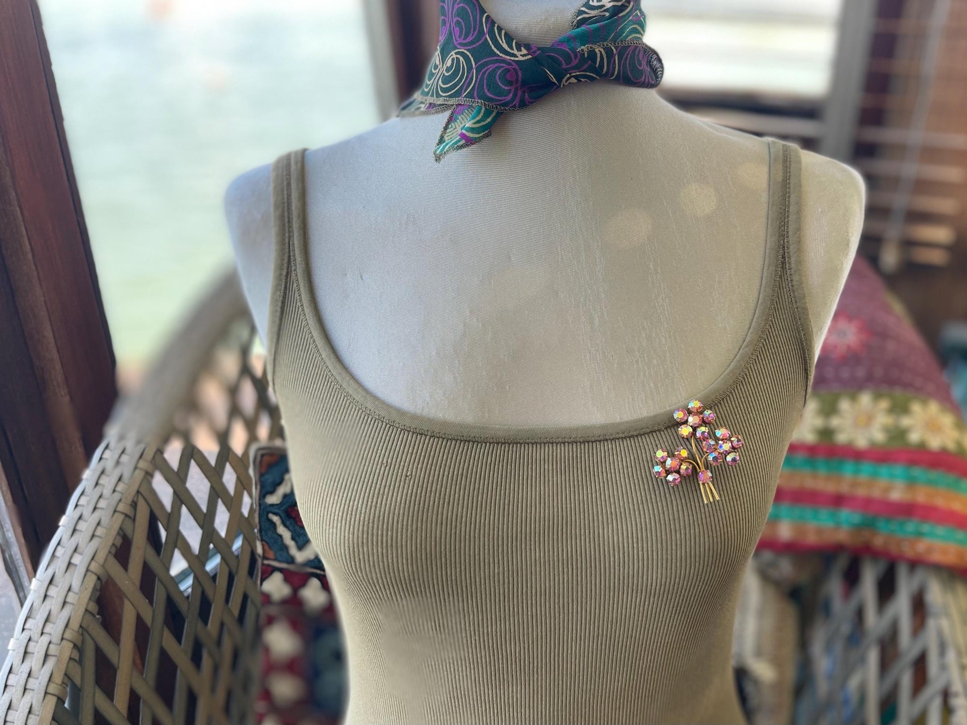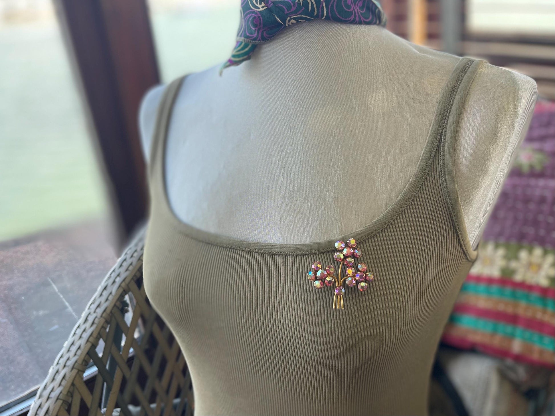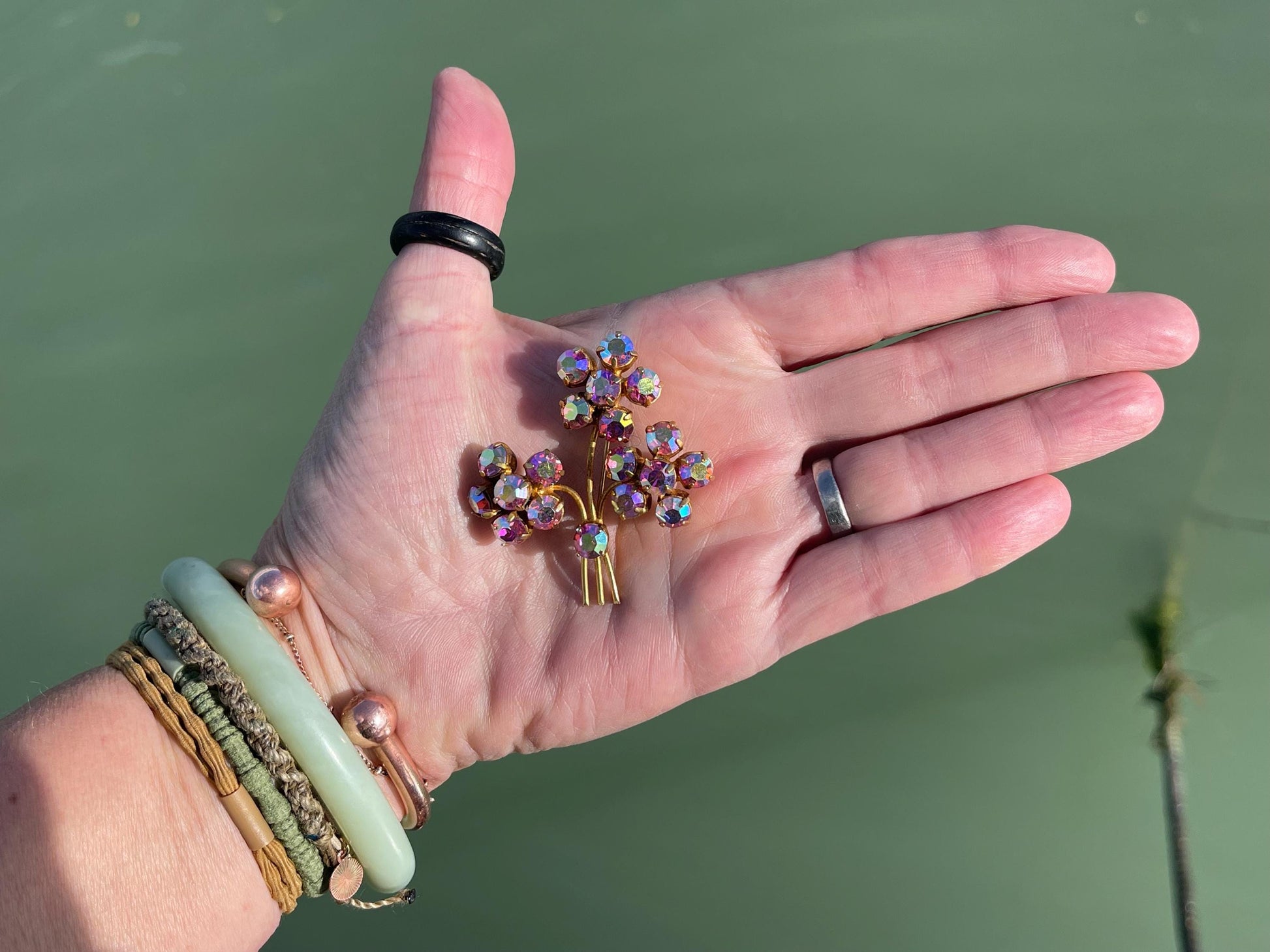 An absolutely stunning vintage brooch in the shape of a flower. It shines beautifully in the light.