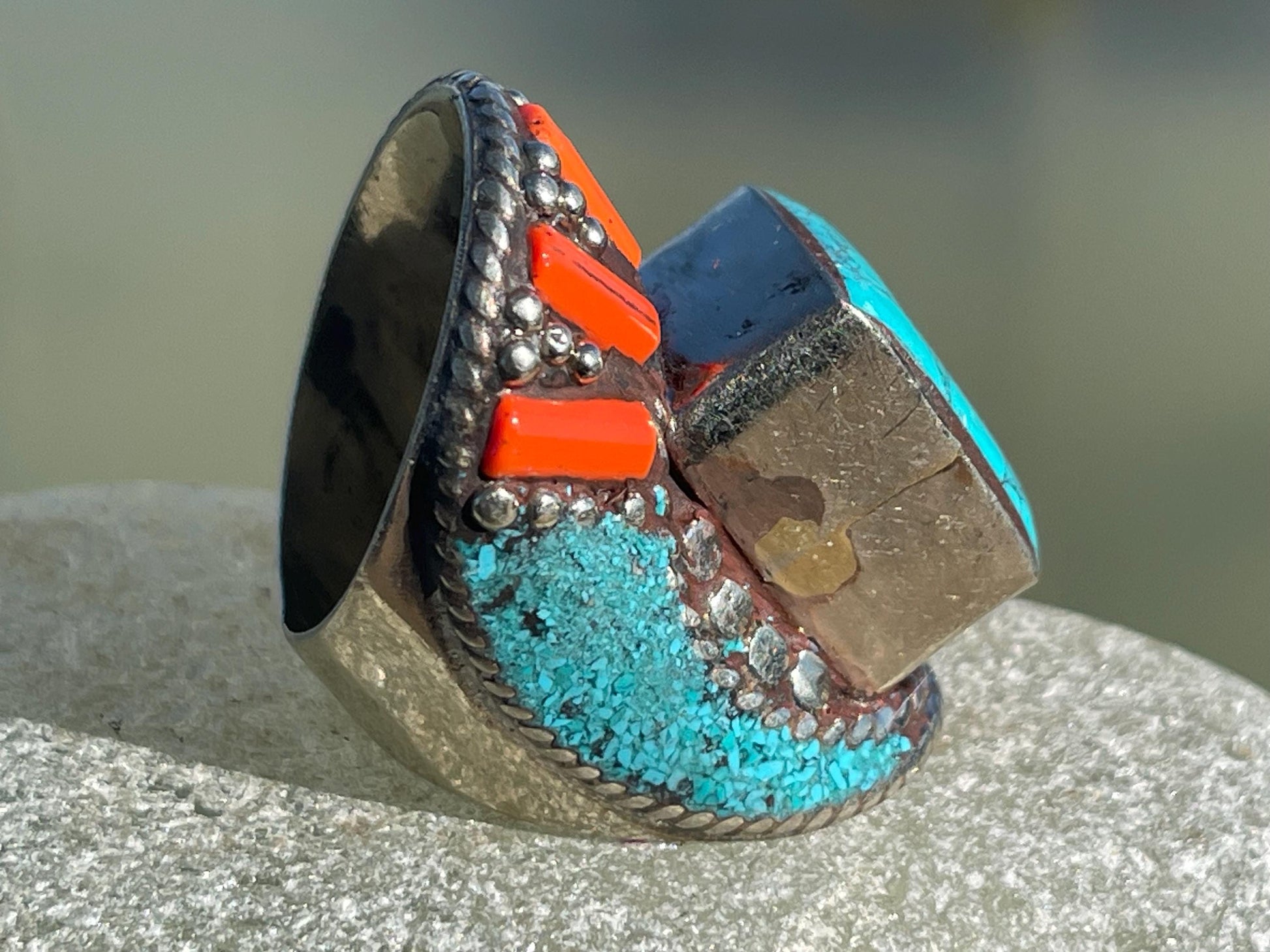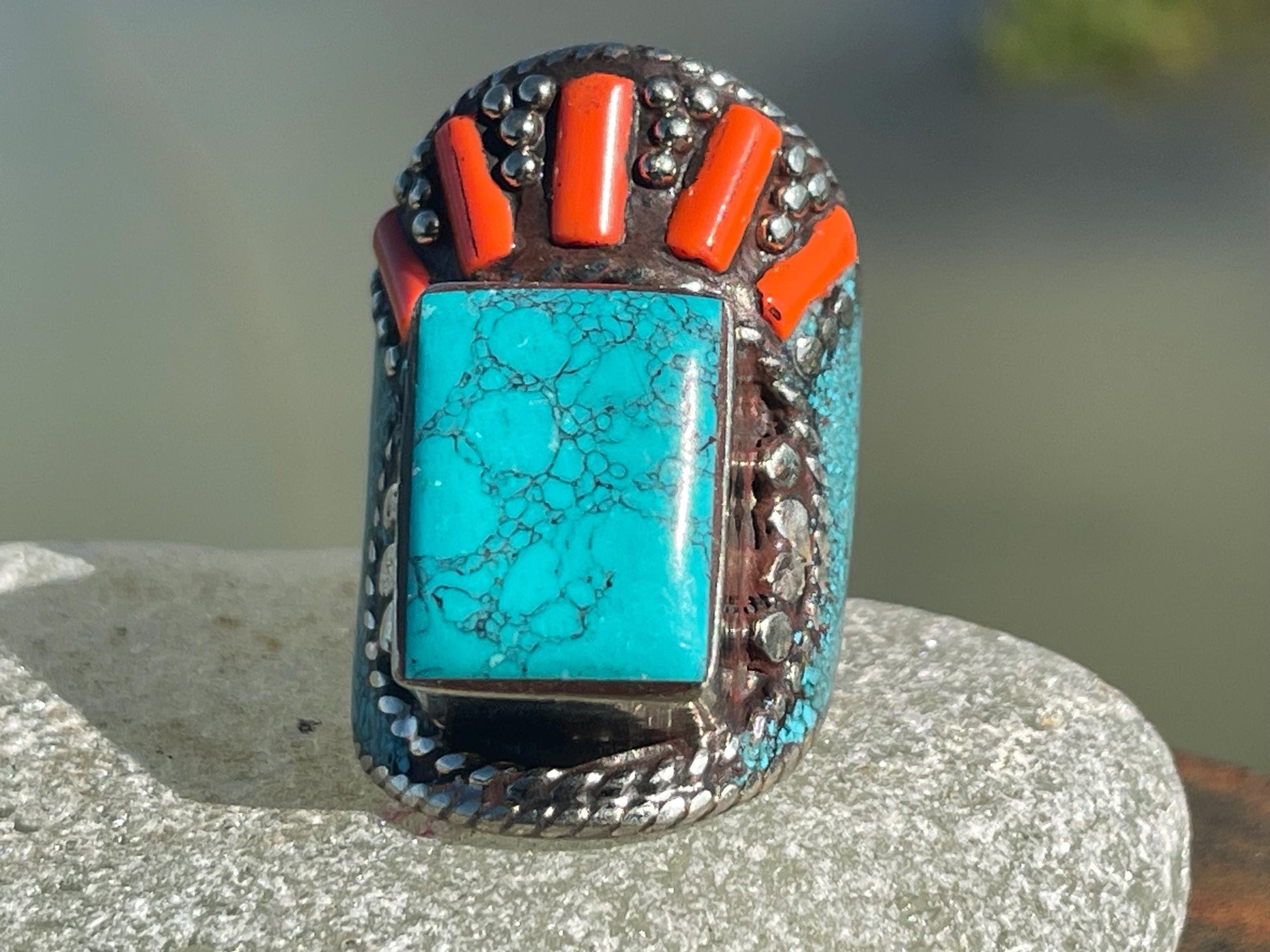 Nepalese vintage ring showcasing what I believe to be coral and turquoise gemstones.
