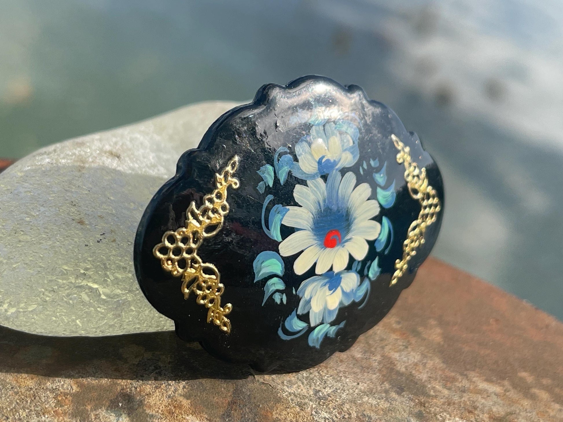 The brooch features a floral design with white and blue flowers and a gold-colored border. 6cms.